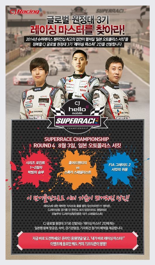 CJ레이싱팀이 오는 8월 2~3일, 일본 오토폴리스 서킷에서 개최될 슈퍼레이스 챔피언십 4라운드를 직접 관전할 ‘글로벌 원정대’ 2인을 선발한다.