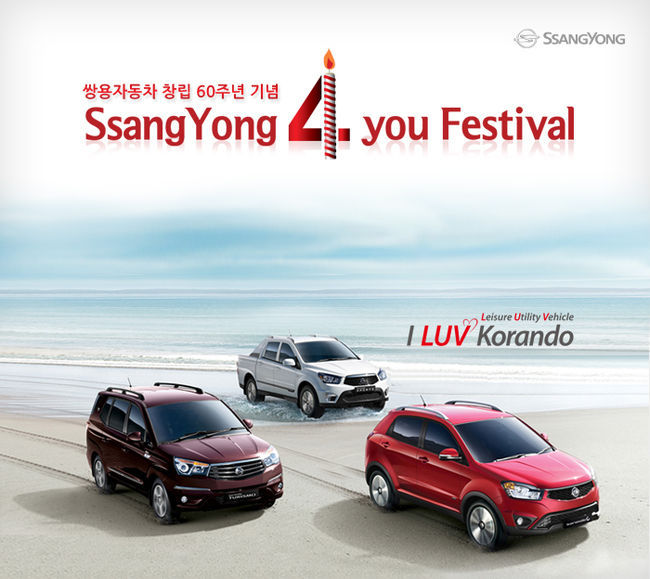1954년 창립 후 올해로 60주년을 맞은 쌍용차는 오는 8월 31일까지 구매자 및 전시장 방문자들을 대상으로 네 가지의 혜택을 제공하는 '쌍용 포 유 페스티벌(Ssangyong 4 You Festival)'을 진행한다.