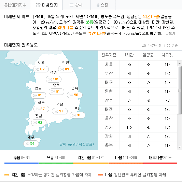 에어코리아에 따르면 15일 우리나라 미세먼지(PM10) 농도는 수도권, 영남권은 약간 나쁨(일평균 81~120 ㎍/㎥) 수준이다. 그 밖의 권역은 보통(일평균 31~80 ㎍/㎥)으로 예상된다.