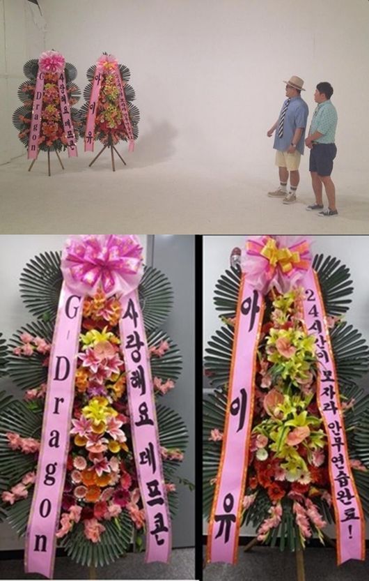 MBC 에브리원 '주간아이돌' 측은 15일 오후 공식 트위터 계정을 통해 지드래곤과 아이유가 직접 보낸 화환 사진을 게재하며 그들을 향한 고마움을 표현했다.