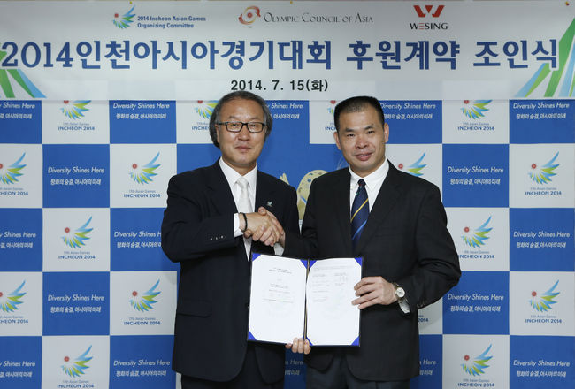 2014 인천아시아경기대회 조직위원회(위원장 김영수)는 15일 송도 미추홀타워 영상회의실에서 중국 복건성 소재 스포츠용 기구 회사인 웨싱(WESING FUJIAN WEIZHIXING SPORTS GOODS CO., LTD)과 조인식을 갖고 인천아시안게임 복싱과 공수도 2개 종목의 경기용기구 부문 공식후원계약을 체결했다.