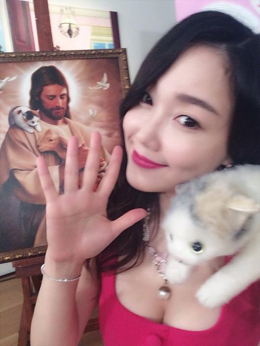 공개된 사진 속 그는 자신의 고양이 인형 코코샤넬을 어깨에 올리며 환한 미소를 짓고 있다. 몸매를 드러내는 아찔한 붉은색 의상이 눈길을 끈다. 메이크업 역시 의상에 맞는 붉은 빛을 띠고 있다. 그의 뒤로는 본인이 직접 그린 유화작품이 전시돼 있어 인상적이다.
