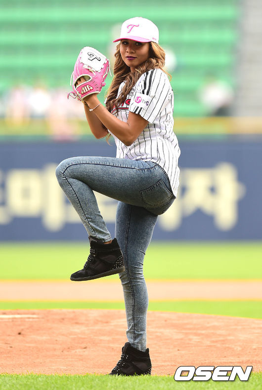 15일 오후 서울 잠실구장에서 열린 '2014 한국야쿠르트 세븐 프로야구' LG 트윈스와 삼성 라이온즈의 경기 시작전 제네비브 잭슨이 시구를 하고 있다.