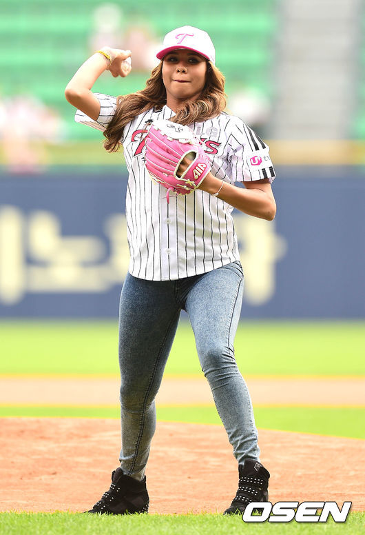 15일 오후 서울 잠실구장에서 열린 '2014 한국야쿠르트 세븐 프로야구' LG 트윈스와 삼성 라이온즈의 경기 시작전 제네비브 잭슨이 시구를 하고 있다.