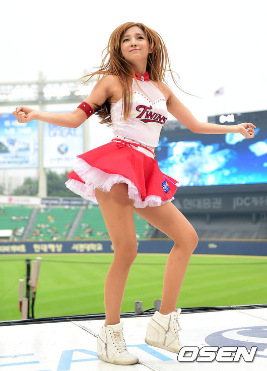 15일 오후 서울 잠실구장에서 열린 '2014 한국야쿠르트 세븐 프로야구' LG 트윈스와 삼성 라이온즈의 경기, 치어리더 강윤이가 공연을 펼치고 있다.