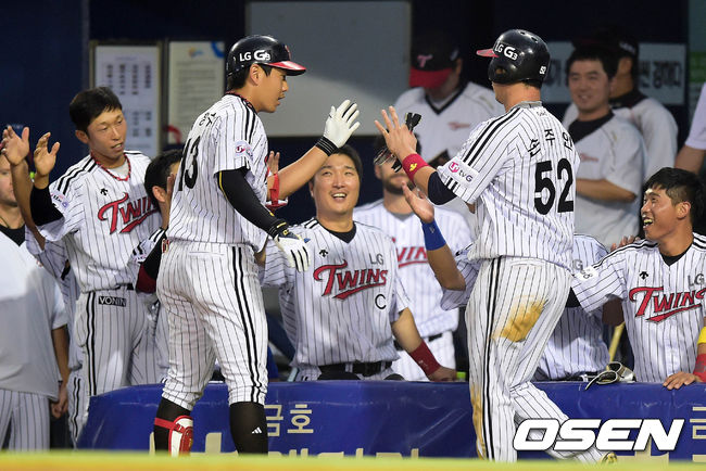 15일 오후 서울 잠실구장에서 열린 '2014 한국야쿠르트 세븐 프로야구' LG 트윈스와 삼성 라이온즈의 경기 4회말 1사 3루 백창수의 희생플라이에 득점한 손주인이 덕아웃에서 동료들과 하이파이브를 하고 있다.