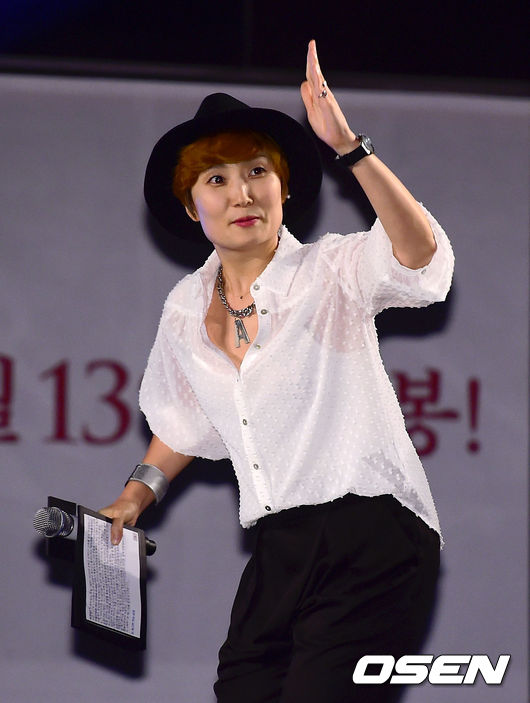 박경림이 관객들을 향해 인사하며 무대로 입장하고 있다.
