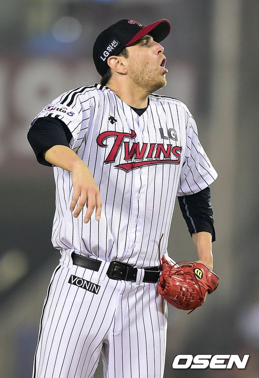15일 오후 서울 잠실구장에서 열린 '2014 한국야쿠르트 세븐 프로야구' LG 트윈스와 삼성 라이온즈의 경기 7회초 리오단이 마운드에서 호흡을 가다듬고 있다.