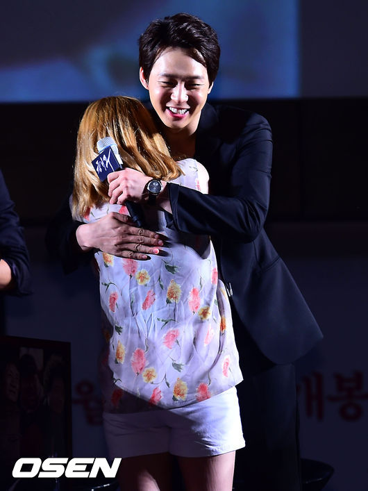 박유천이 이벤트에 당첨된 관객과 포옹을 나누고 있다.