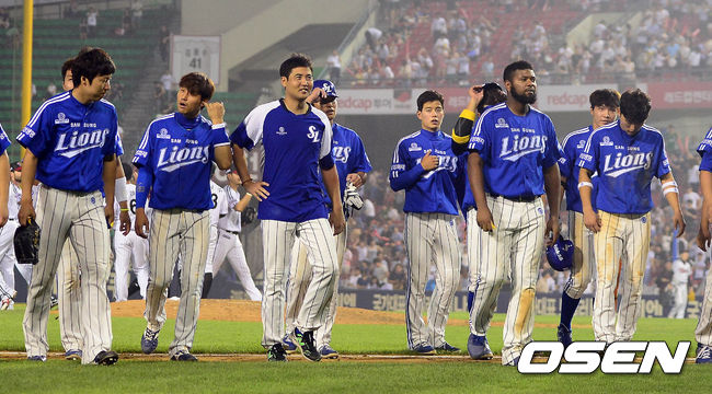 15일 오후 서울 잠실구장에서 열린 '2014 한국야쿠르트 세븐 프로야구' LG 트윈스와 삼성 라이온즈의 경기 종료 후 삼성 선수들이 팬들에게 인사 후 그라운드를 빠져나가고 있다.