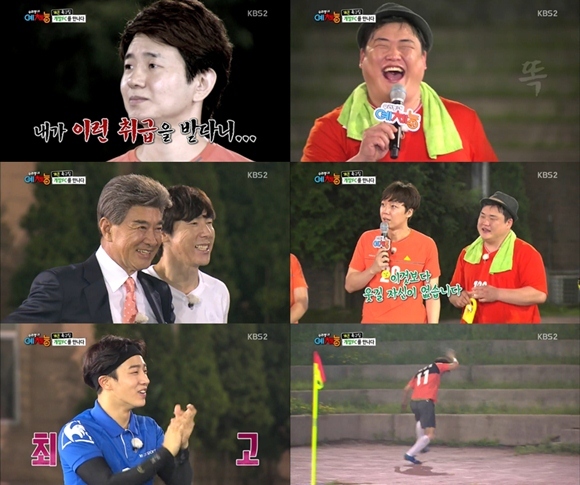 15일 오후 방송된 KBS 2TV 예능프로그램 '우리동네 예체능'에서는 예체능 팀과 '개그콘서트' 축구팀의 대결이 진행됐다.