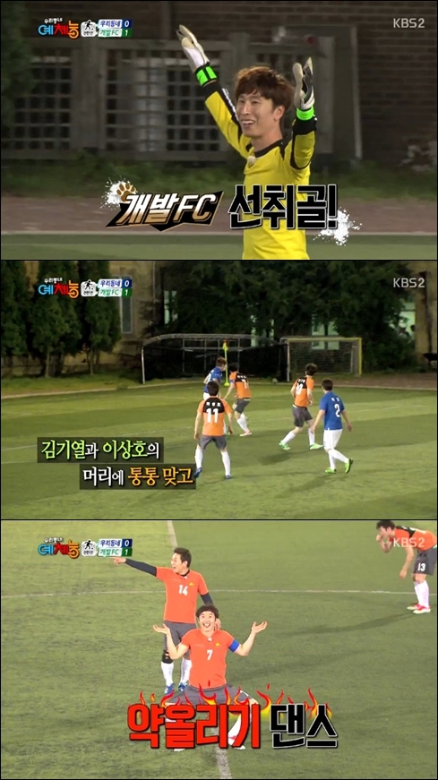 15일 오후 방송된 KBS 2TV 예능프로그램 '우리동네 예체능'에서 '개콘 축구팀' 개발 FC의 선수로 나온 이상호가 첫 골을 기록했다.
