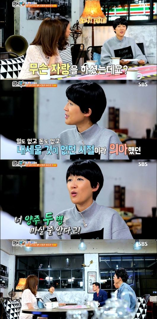 뒤이어 홍진경은 "아버지 고향으로 내려갔었는데 고향분들이 아버지가 내 칭찬을 많이 했다고 하시더라"며 당시 상황을 회상했다. 이어 그는 "당시 방송활동이 없었기 때문에 무슨 칭찬을 하셨는지 궁금했다"며 "근데 칭찬이 내가 양주 2병 마신 줄 안다는 거였다"고 말해 웃음을 자아냈다.