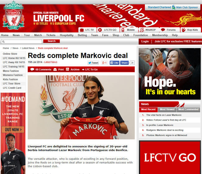 리버풀이 마르코비치의 영입을 완료했다. 리버풀은 16일(이하 한국시간) 공식 홈페이지를 통해 "마르코비치의 영입을 완료했다. 세르비아 국가대표인 마르코비치와 계약 사실을 발표하게 돼 기쁘다"고 발표했다. 이로써 리버풀은 리키 램버트와 아담 랄라나, 엠레 칸에 이어 여름 이적시장에서의 4번째 선수 영입을 공식화했다.
