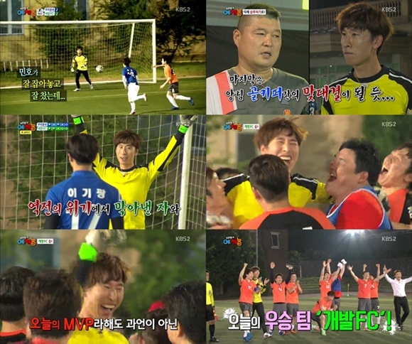 먼저 양상국은 '개그콘서트' 팀의 선제골을 이끌어냈다. 골키퍼 양상국이 걷어낸 공을 이상호가 득점으로 선공시킨 것. 이어 민호가 동점골을 넣었고, 이후 윤두준과 이기광, 민호, 서지석의 활약이 이어졌지만 양상국은 이를 모두 막아내며 '개그콘서트' 팀을 승리로 이끌었다.