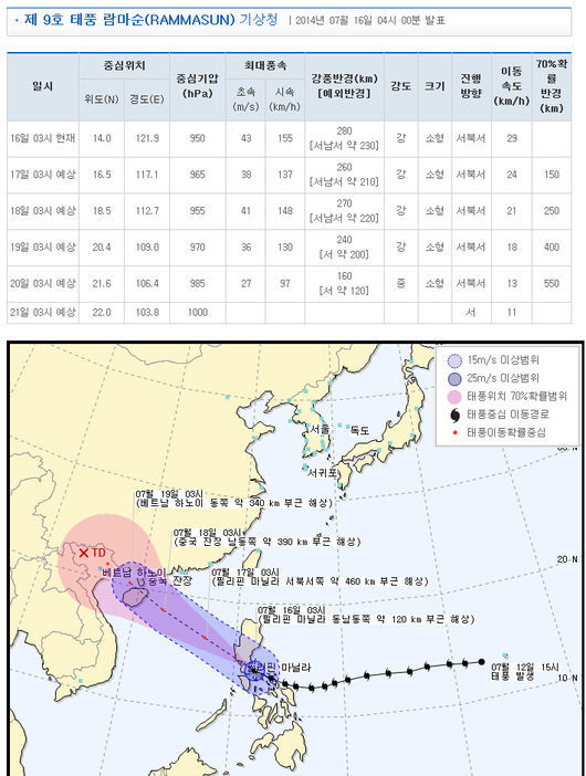 기상청에 따르면 16일 오전 3시 필리핀 마닐라 동남동쪽 약 120km 부근 해상을 지난태풍 람마순은 서북서쪽으로 이동함에 따라 오는 19일 베트남 하노이 동쪽 약 340km 부근 해상으로 진출할 것으로 예상된다.