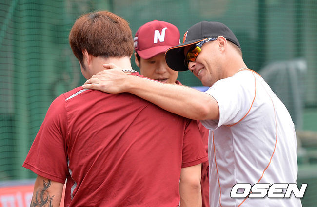 경기에 앞서 롯데 옥스프링과 넥센 박병호가 이야기를 나누고 있다.