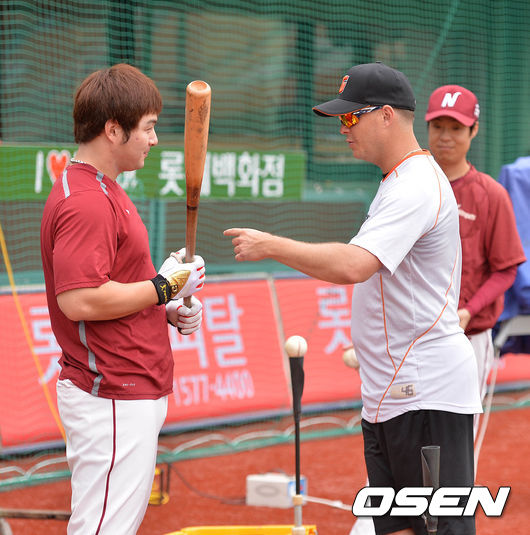 경기에 앞서 롯데 옥스프링과 넥센 박병호가 이야기를 나누고 있다.