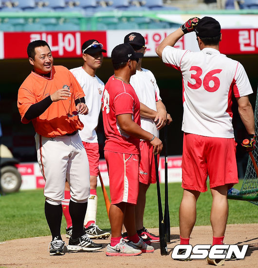 16일 오후 인천 문학야구장에서 열린 '2014 한국야쿠르트 세븐 프로야구' SK 와이번스와 한화 이글스의 경기 전, 한화 조인성이 SK 타격 훈련때 찾아봐 인사를 하고 있다.