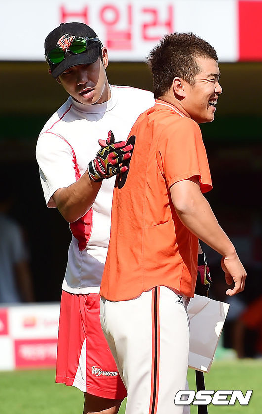 16일 오후 인천 문학야구장에서 열린 '2014 한국야쿠르트 세븐 프로야구' SK 와이번스와 한화 이글스의 경기 전, 한화 정근우가 SK 타격 훈련때 찾아갔을때 김강민이 정근우의 유니폼을 쓰다듬고 있다.