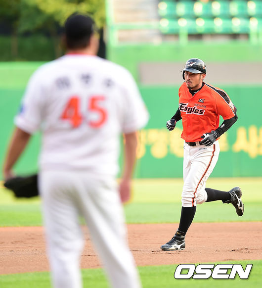 16일 오후 인천 문학야구장에서 열린 '2014 한국야쿠르트 세븐 프로야구' SK 와이번스와 한화 이글스의 경기, 1회초 1사 주자 2루 한화 김경언이 우월 선취 투런 홈런을 날린 후 그라운드를 돌고 있다.