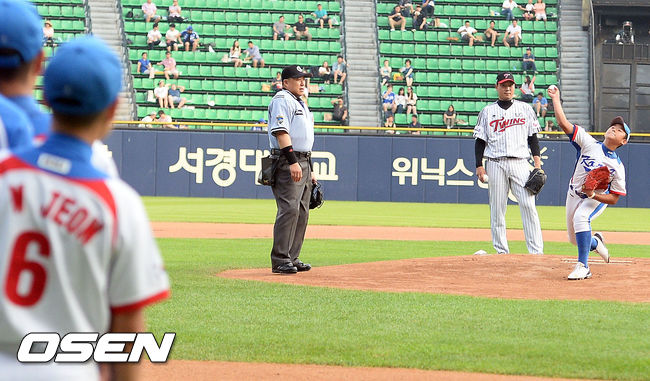 16일 오후 서울 잠실구장에서 열린 2014 한국야쿠르트 세븐 프로야구 LG 트윈스와 삼성 라이온스의 경기에 앞서 세계 리틀야구선수권 대회에서 우승을 이룬 13세 이하 야구국가대표팀 황재영이 시구를 하고 있다.