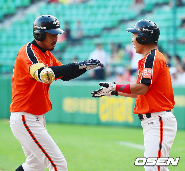 16일 오후 인천 문학야구장에서 열린 '2014 한국야쿠르트 세븐 프로야구' SK 와이번스와 한화 이글스의 경기, 1회초 1사 주자 2루 한화 김경언이 우월 선취 투런 홈런을 날린 후 홈에서 선행주자 정근우와 함께 하이파이브를 하고 있다.