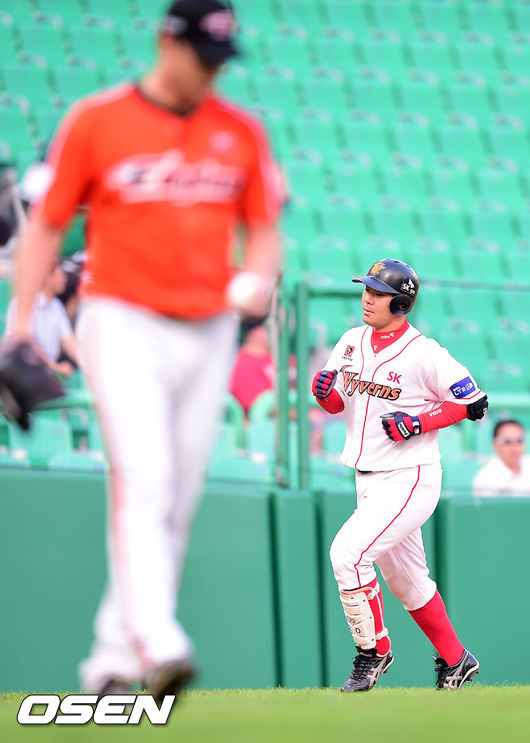 16일 오후 인천 문학야구장에서 열린 '2014 한국야쿠르트 세븐 프로야구' SK 와이번스와 한화 이글스의 경기, 1회말 2사 주자 1,2루 SK 이재원이 역전 좌월 스리런 홈런을 날린 후 그라운드를 돌고 있다.