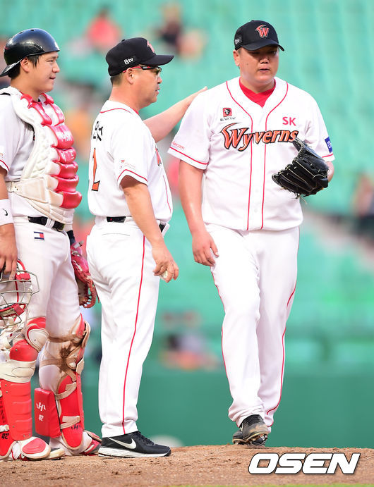 16일 오후 인천 문학야구장에서 열린 '2014 한국야쿠르트 세븐 프로야구' SK 와이번스와 한화 이글스의 경기, 2회초 1사 주자 없는 상황에서 한화 김태완에게 백투백 홈런을 맞은 SK 채병용이 강판당하고 있다.