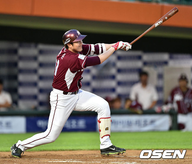 4회초 무사 1루에서 넥센 유한준의 좌익수키를 넘기는 적시 2루타를 치고 있다.
