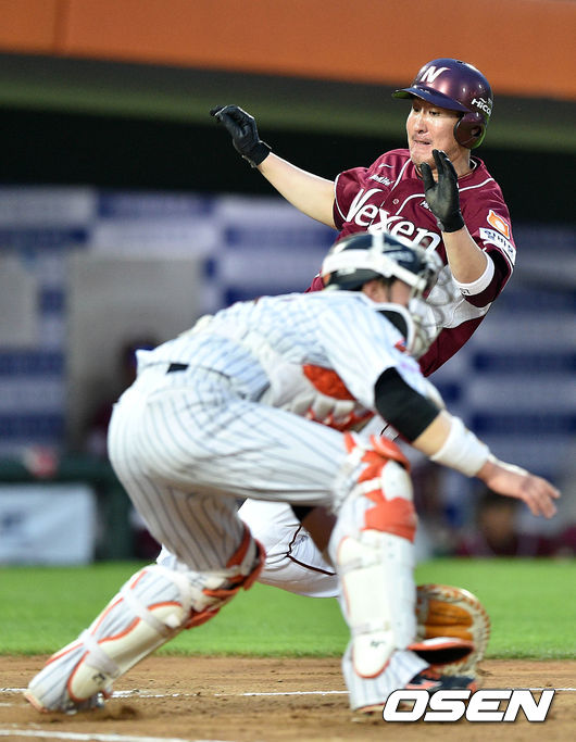 4회초 1사 1,2루에서 넥센 김민성의 좌전 적시타때 2루주자 유한준이 홈으로 쇄도해 세이프 되고 있다.