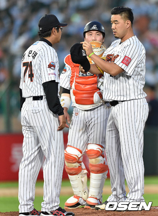 4회초 1사 1,2루에서 롯데 장원준과 교체된 송승준이 마운드를 방문한 정민태 코치와 이야기를 나누고 있다.