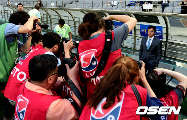 경기에 앞서 서울 최용수 감독과 포항 황선홍 감독이 취재진에 둘러싸여 있다.