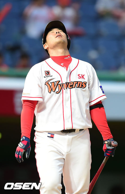 16일 오후 인천 문학야구장에서 열린 '2014 한국야쿠르트 세븐 프로야구' SK 와이번스와 한화 이글스의 경기, 3회말 2사 주자 2루 SK 이재원이 타석에서 삼진아웃을 당한 후 아쉬워하고 있다.
