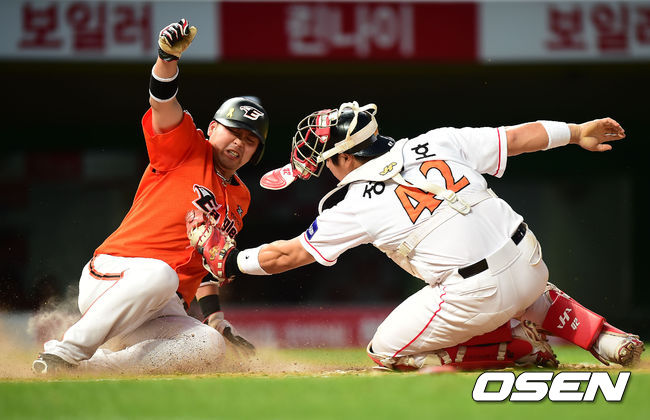 16일 오후 인천 문학야구장에서 열린 '2014 한국야쿠르트 세븐 프로야구' SK 와이번스와 한화 이글스의 경기, 4회초 무사 주자 1,3루 한화 고동진의 좌익수 희생플라이때 3루 주자 김태완이 홈으로 몸을 던져 세이프 되고 있다.