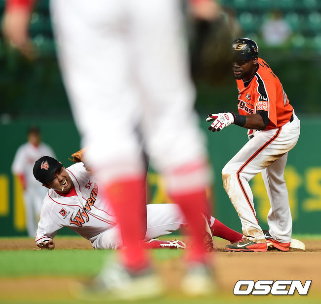 16일 오후 인천 문학야구장에서 열린 '2014 한국야쿠르트 세븐 프로야구' SK 와이번스와 한화 이글스의 경기, 4회말 1사 주자 1루 한화 이학준 타석에서 1루 주자 피에가 2루 도루를 시도했으나 실패하며 나주환의 발을 실수로 밟고 있다.