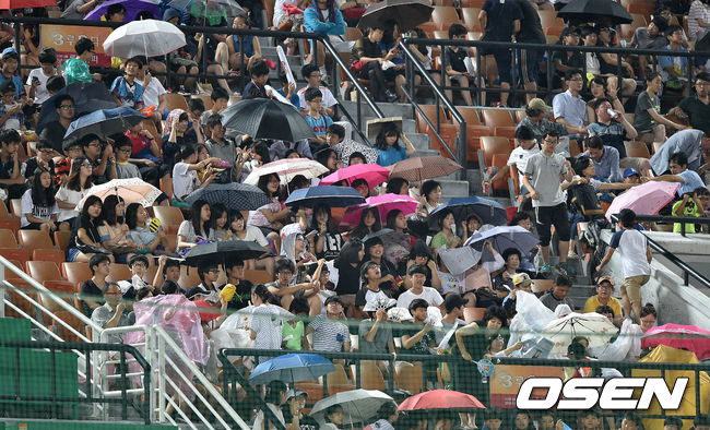 5회초 비가 내리는 가운데 야구팬들이 우산을 쓰고 열띤 응원을 펼치고 있다.