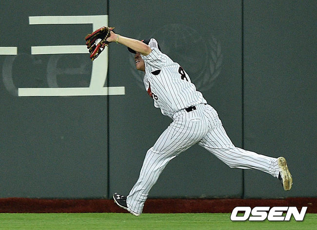 5회초 1사에서 롯데 전준우가 넥센 서건창을 외야플라이로 처리하고 있다.