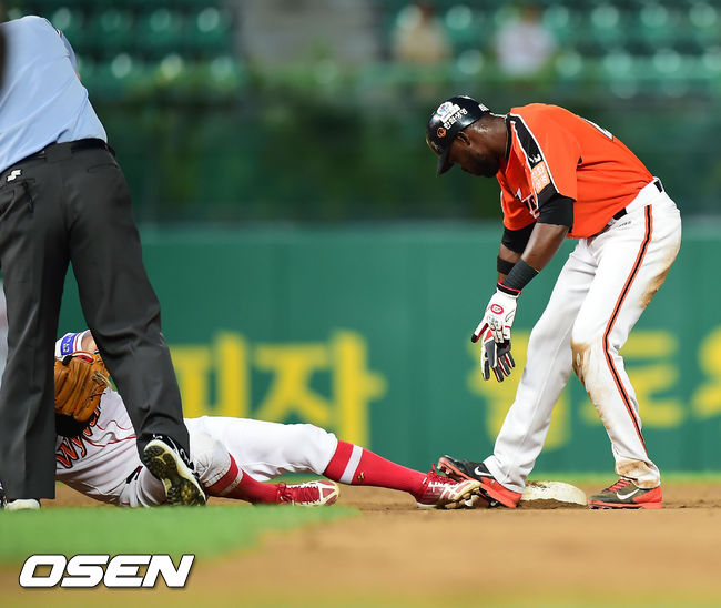 16일 오후 인천 문학야구장에서 열린 '2014 한국야쿠르트 세븐 프로야구' SK 와이번스와 한화 이글스의 경기, 4회말 1사 주자 1루 한화 이학준 타석에서 1루 주자 피에가 2루 도루를 시도했으나 실패하며 나주환의 발을 실수로 밟은 후 놀라고 있다.