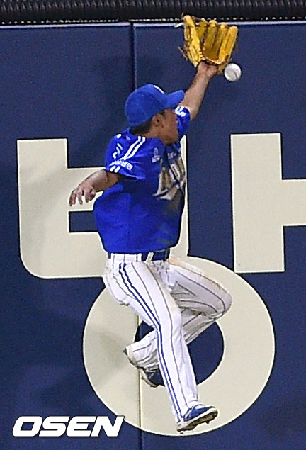 16일 오후 서울 잠실구장에서 열린 2014 한국야쿠르트 세븐 프로야구 LG 트윈스와 삼성 라이온스의 경기, 5회말 LG 선수타자 정성훈의 2루타때 삼성 우동균 좌익수가 타구를 놓치고 있다.