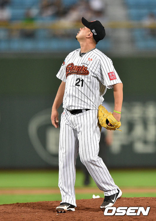 7회초 1사에서 롯데 송승준이 넥센 박동원에게 좌월 솔로 홈런을 허용하고 타구를 바라보고 있다.