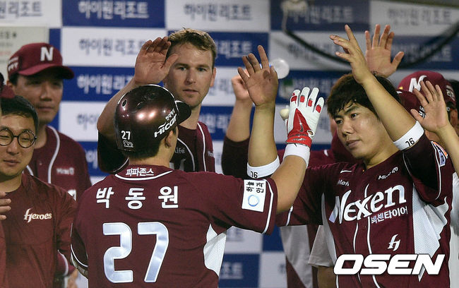 7회초 1사에서 넥센 박동원이 좌월 솔로 홈런을 치고 더그아웃에서 동료들의 축하를 받고 있다.