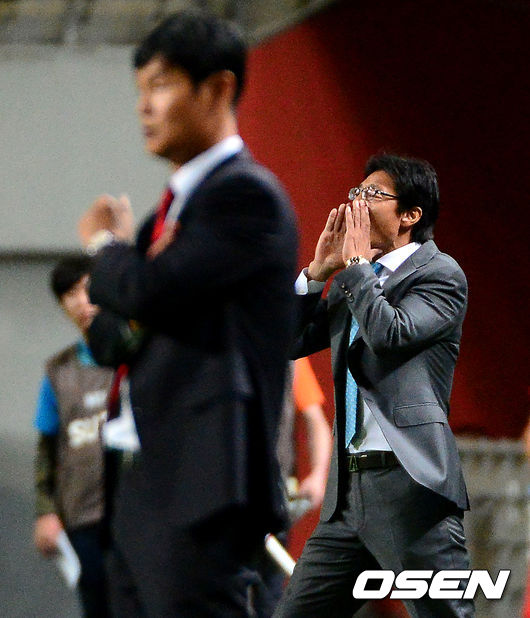후반 포항 황선홍 감독이 선수들을 독려하고 있다.