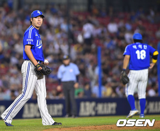 16일 오후 서울 잠실구장에서 열린 2014 한국야쿠르트 세븐 프로야구 LG 트윈스와 삼성 라이온스의 경기, 6회말 2사 만루 LG 스나이더의 타석때 홈스틸 허용한 삼성 차우찬 투수가 아쉬워하고 있다.