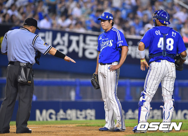 16일 오후 서울 잠실구장에서 열린 2014 한국야쿠르트 세븐 프로야구 LG 트윈스와 삼성 라이온스의 경기, 6회말 2사 만루 LG 스나이더의 타석 홈스틸 허용한 삼성 차우찬 투수가 추평호 구심에게 항의하고 있다
