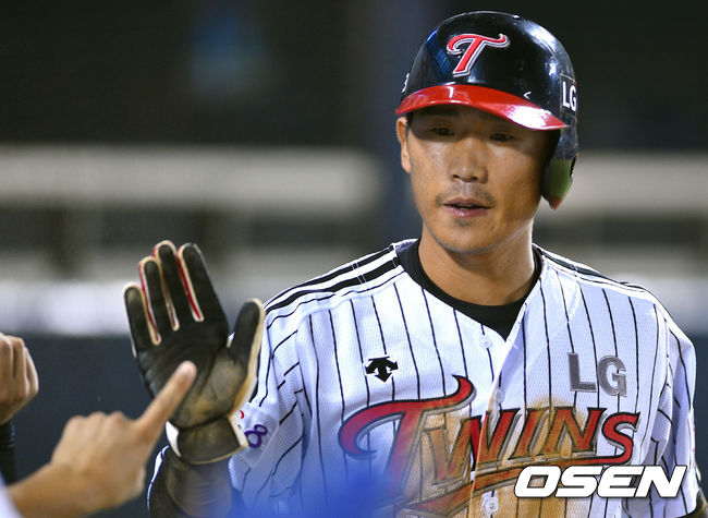 16일 오후 서울 잠실구장에서 열린 2014 한국야쿠르트 세븐 프로야구 LG 트윈스와 삼성 라이온스의 경기, 6회말 2사 만루 LG 스나이더의 타석때 3루 주자 박경수가 홈스틸 성공한 뒤 동료들과 하이파이브를 하고 있다.