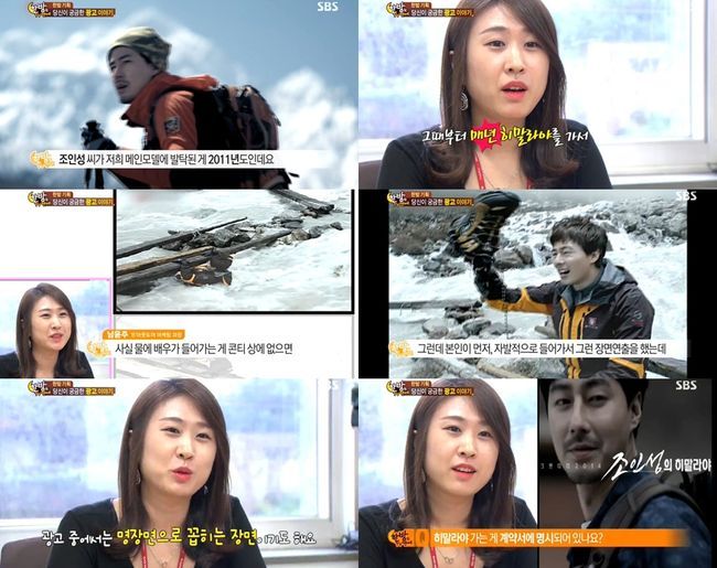 이날 방송에서 아웃도어 브랜드 측 관계자는 "조인성이 매년 히말라야에 간다"면서 "배우가 콘티에 물에 들어가는 장면이 없으면 안 하는데 조인성은 본인이 직접 물에 들어가는 장면을 제의, 광고 중 명장면이 탄생하기도 했다"고 말했다.