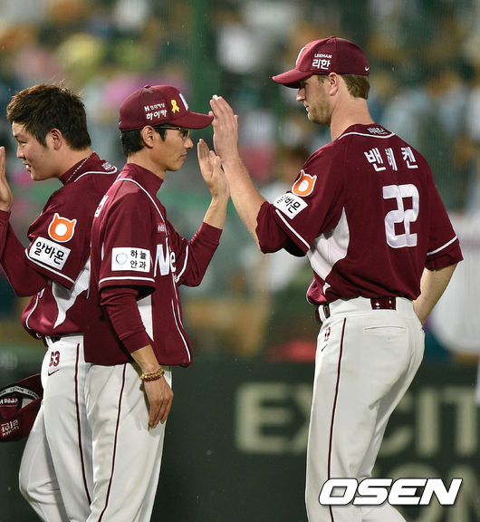 경기 종료 후 넥센 염경엽 감독이 벤 헤켄과 승리의 기쁨을 나누고 있다. /sunday@osen.co.kr