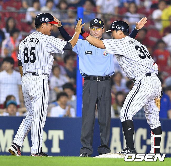 16일 오후 서울 잠실구장에서 열린 2014 한국야쿠르트 세븐 프로야구 LG 트윈스와 삼성 라이온스의 경기, 7회말 LG 선두타자 이진영이 3루타를 날리고 최태원 코치와 하이파이브를 하고 있다. 이진영은 이날 3루타로 통산 2500루타를 기록했다.