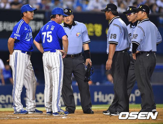 16일 오후 서울 잠실구장에서 열린 2014 한국야쿠르트 세븐 프로야구 LG 트윈스와 삼성 라이온스의 경기, 6회말 2사 만루 LG 스나이더의 타석때 3루 주자 박경수가 홈스틸 성공했다. 삼성 류중일 감독이 세이프 판정에 항의하고 있다
